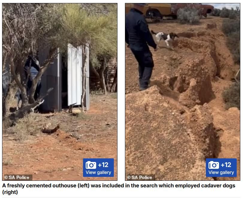 On Tuesday, officers and cadaver dogs brought in from New South Wales inspected a water tank and a freshly cemented outhouse at a sheep station owned by Gus’ family located 30km west of Oak Park Station.